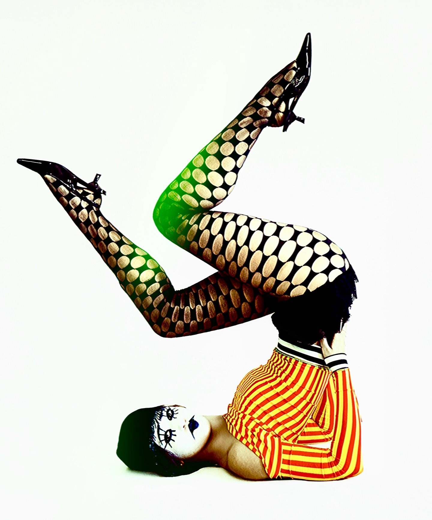 I worked with bold bursts of color, patterned stockings, and utilized makeup to create an unsettling expression against a flat background. These choices were deliberate— stylistic rebellion as a form of resistance. Pierrette became a study in both visual disruption and reclamation. At its core, this work is more than just imagery— it's about reframing the gaze. I wanted Pierrette to hold space as her own, unapologetic subject, challenging archetypes and carving out an identity that refuses to be secondary.